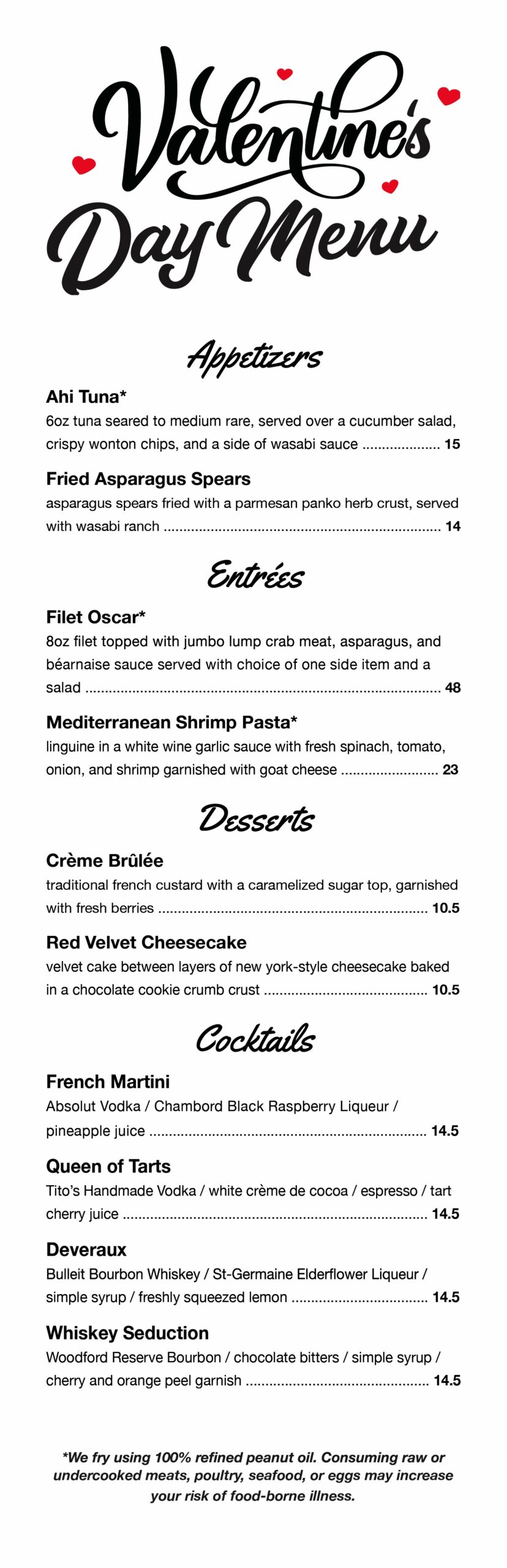 Valentine’s Day Menu available February 13th & 14th starting at 4:00 p.m.