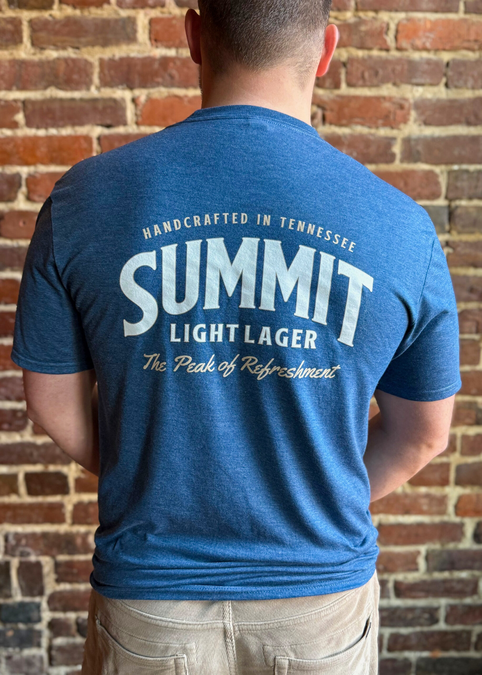 A soft, lightweight, tri-blend District brand t-shirt in heathered blue. Featuring our own Summit Light Lager on the back.Â